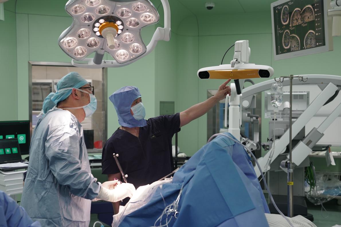 中国首例无线侵入式脑机接口系统前瞻性临床试验手术现场,华山医院吴劲松教授与路俊锋教授做讨论