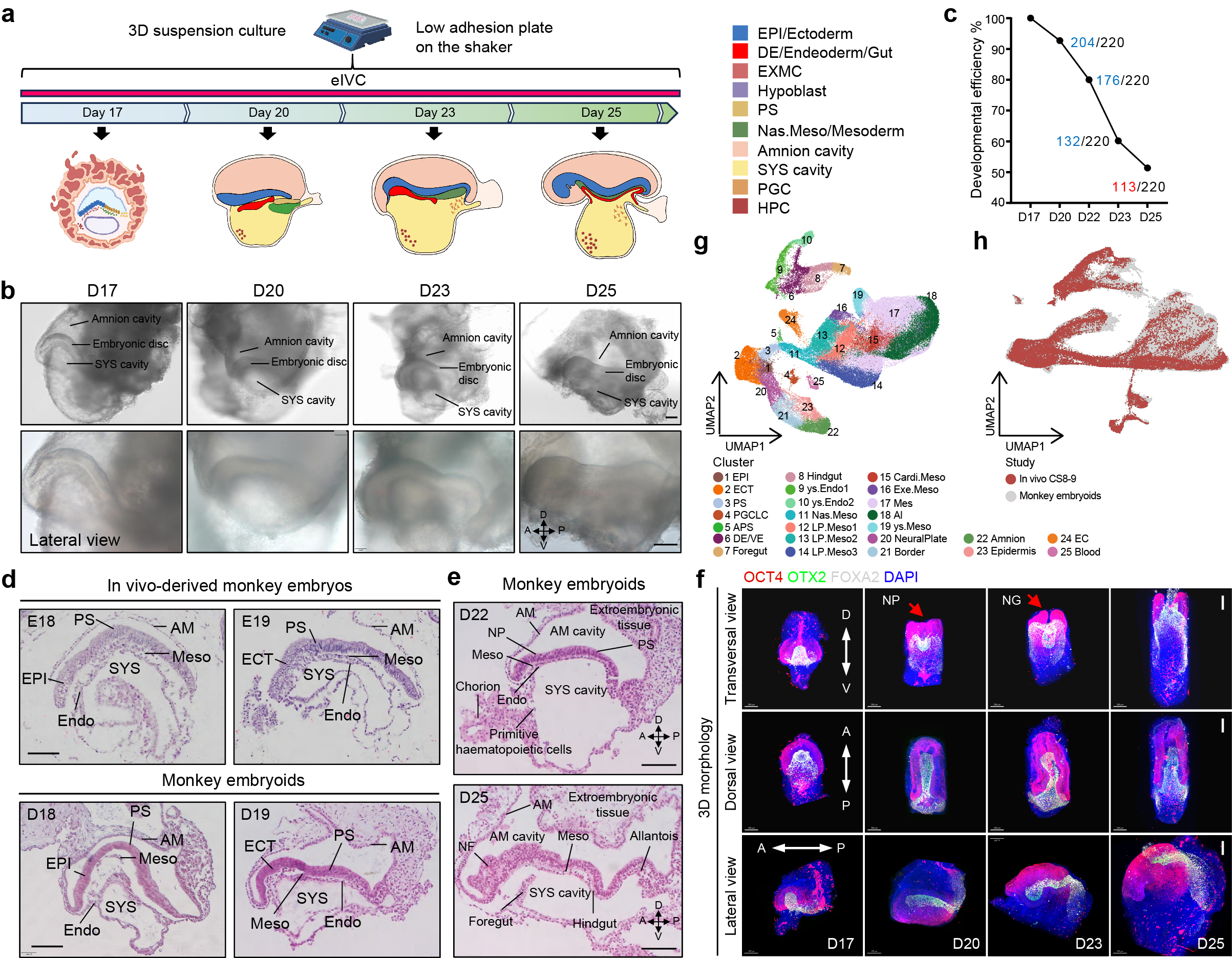 图1. (a) 猴类胚胎发育至第25天(D25)的三维悬浮培养系统示意图。(b) D17至D25猴类胚胎明场图。(c) D17至D25期间猴类胚胎发育效率统计。(d) E18和E19阶段天然猴胚胎(上)及D18、D19猴类胚胎(下)的对比。(e) 猴类胚胎在第22天(D22)和第25天(D25)的H&E染色图像。(f) D17-D25阶段猴类胚胎的3D重构图。(g) UMAP展示猴类胚胎所有细胞类型的分布。(h)猴类胚胎与CS8-9阶段天然猴胚胎的单细胞整合分析。