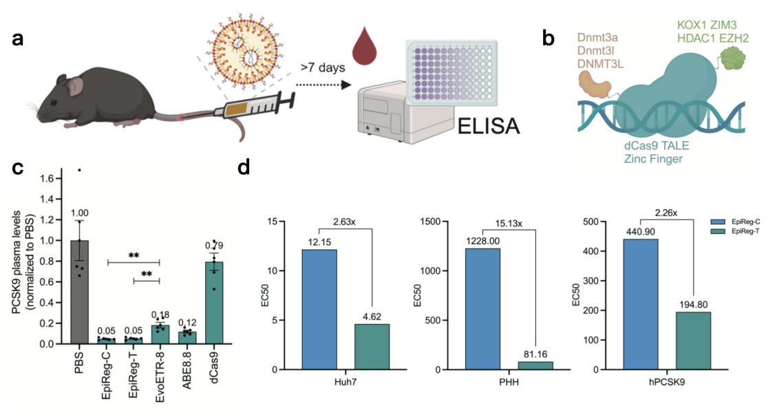 近期,锌指蛋白和dCas9的表观遗传编辑疗法已经展现出了巨大潜力,已有研究在小鼠和非人灵长类体内成功抑制了PCSK9的表达,从而有效降低了血液中的胆固醇水平。PCSK9是调控血液中“坏胆固醇” (LDL-C)的关键蛋白,抑制它已成为预防和治疗心血管疾病的重要策略。