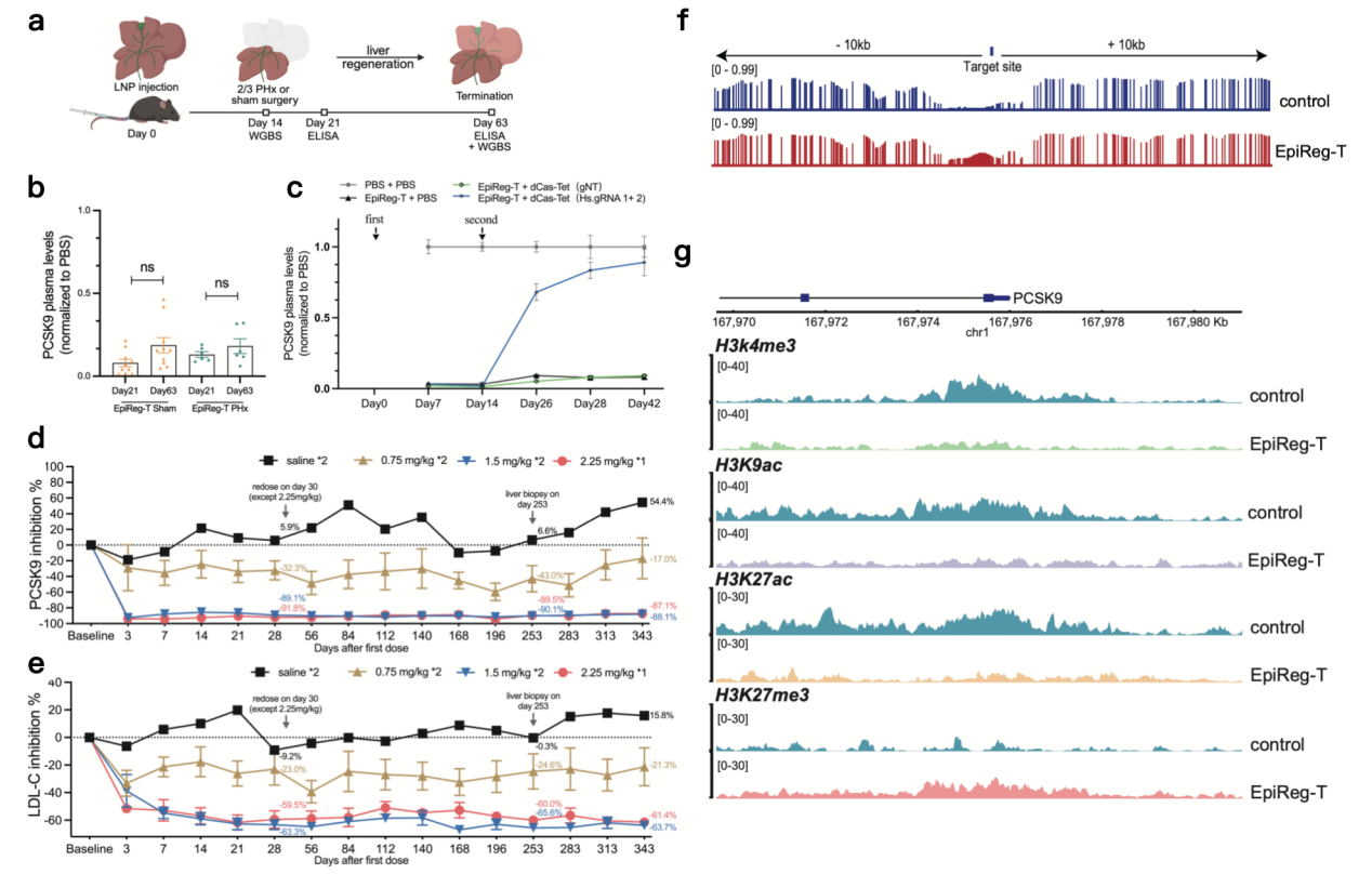 鉴于EpiReg-T的低剂量高效优势,团队将其用于后续的长期验证。为了验证这种基因沉默能否在细胞更新换代中稳定“遗传”,研究团队进行了小鼠2/3肝切实验(图2a)。结果显示,即使在肝细胞快速再生后,PCSK 9的抑制水平依然稳定如初(图2b)。此外,这种表观抑制还具有“可逆性”这一关键安全特性。在实现PCSK9的深度抑制后,注射一种表观激活工具,即可让其表达水平恢复至初始状态(图2c)。