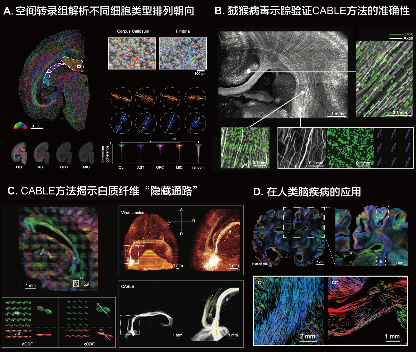 图一. (A)空间转录组验证不同细胞类型形态和排列朝向;(B)狨猴全脑病毒示踪验证CABLE的准确性;(C) CABLE方法揭示狨猴白质纤维“隐藏通路”;(D) CABLE方法在人类脑疾病上的应用