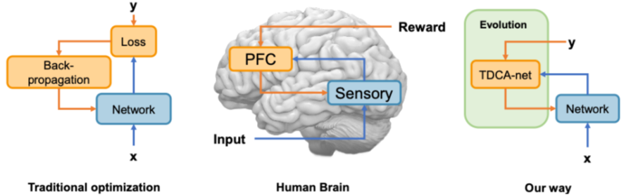图1:不同的学习方式比较:传统人工智能优化,生物大脑以及TDCA网络方法