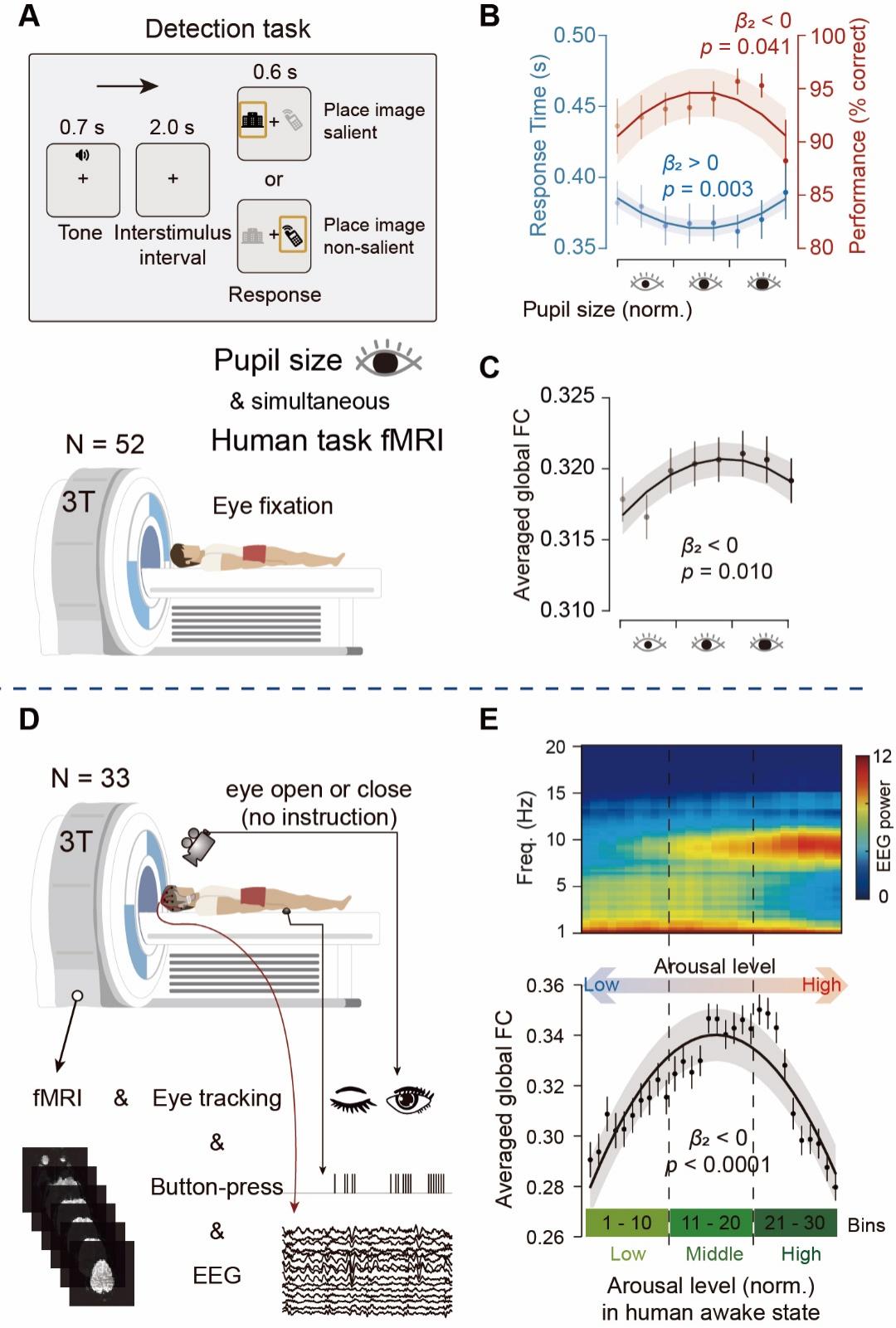 研究团队首先基于人类公开数据集,分析了参与者在执行视觉检测任务时的功能磁共振成像(fMRI)数据,并同步记录其瞳孔直径作为觉醒水平指标。结果显示,在任务状态下,随着觉醒水平的升高,行为表现水平和全脑功能连接的强度呈现出先增强后减弱的“倒U型”变化趋势,峰值出现在中等觉醒水平。同时,人中的静息态fMRI数据表明,受觉醒水平调节的“倒U型”功能连接动态性这一现象在静息状态下也同样存在。