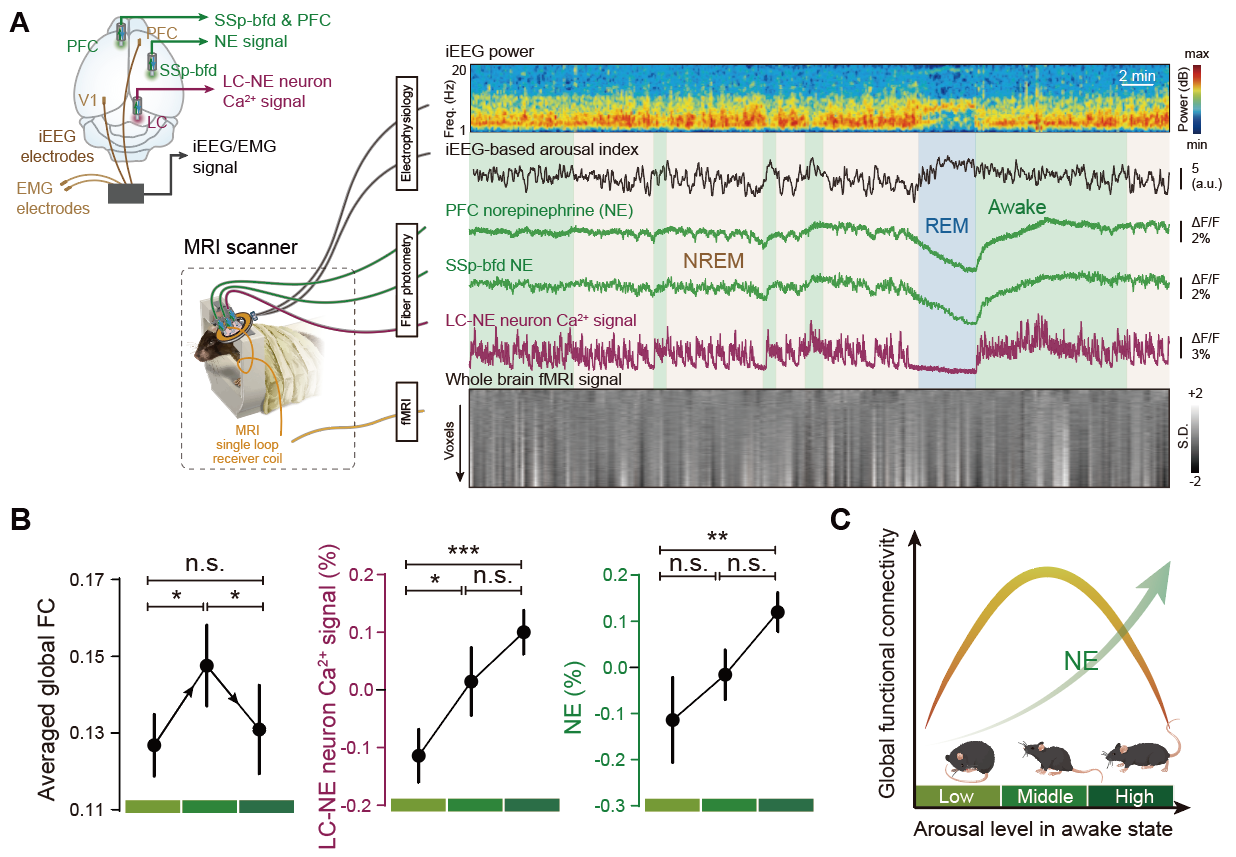 为深入揭示这一现象背后的神经机制,研究团队在清醒小鼠fMRI实验中同步记录了蓝斑核去甲肾上腺素神经元(LC-NE)的钙信号、皮层胞外去甲肾上腺素浓度以及颅内脑电(iEEG)信号。结果表明,LC-NE神经元的自发活动与全脑功能连接强度之间存在着显著的非线性关联。具体表现为:随着LC-NE神经元活动增强及其下游去甲肾上腺素水平的上升,全脑功能连接强度呈现先增强后减弱的“倒U型”变化趋势。