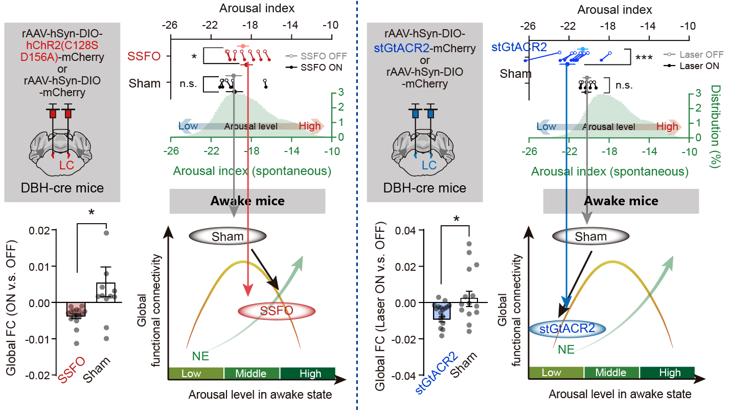 为确立蓝斑核-去甲肾上腺素系统在该现象中的因果作用,研究团队采用了严谨的双向光遗传学干预策略。通过在LC-NE神经元中分别精确表达兴奋型视蛋白(SSFO)或抑制型视蛋白(stGtACR2),实现了对LC-NE神经元活动的增强或抑制的双向调控。使用该范式,研究结果表明,在清醒小鼠中LC-NE神经活动的增强或抑制带来了相应的觉醒水平的上升或下降,并均导致全脑功能连接强度减弱。以上结果说明了LC-NE系统在倒U型关系中的因果性贡献。