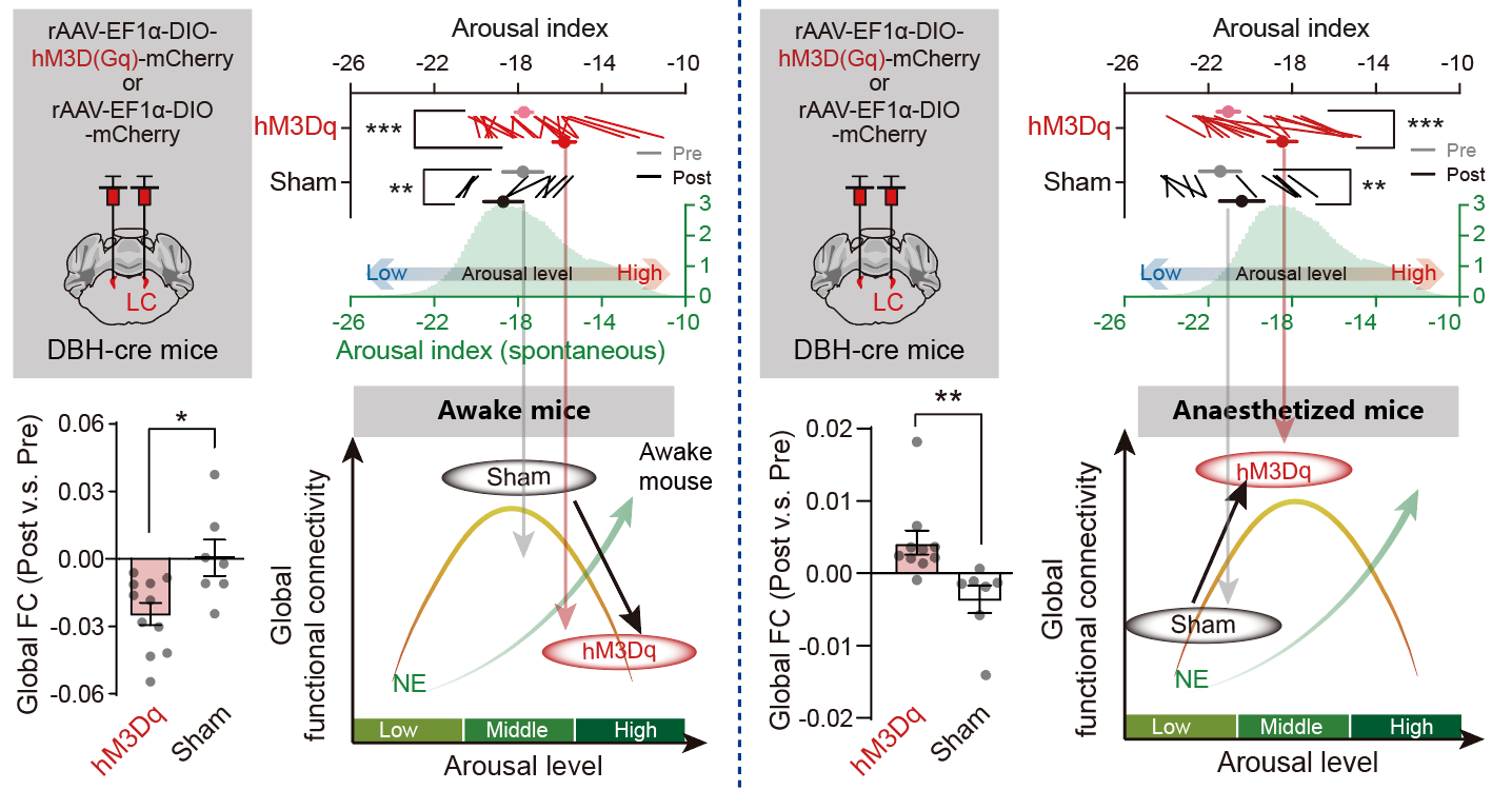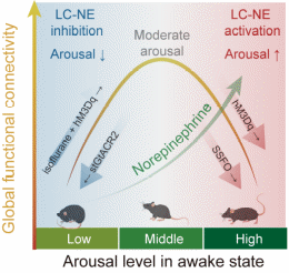 尤为关键的是,为探索其非线性特性的根源,研究人员采用了化学遗传学方法进一步验证。在清醒小鼠中,化学遗传学激活LC-NE神经元,可促使觉醒水平从中等升至高水平,并引发全脑功能连接的降低。在低浓度异氟烷浅麻醉小鼠中,化学遗传学激活LC-NE神经元,则促使觉醒水平从低升至中等水平,并伴随全脑功能连接的增强。这一发现清晰地表明,LC-NE系统对全脑功能连接变化的方向性并非固定不变,而是高度依赖于行为状态所处的初始觉醒水平。