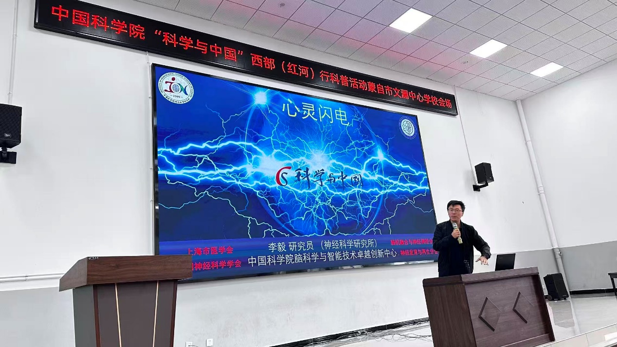 11月3日至4日,李毅研究员参与上海分院组织的“科学与中国”西部行科普活动,历经十小时路程远赴红河,将优质科学资源送达西部青少年身边。他为蒙自市惠民小学、文澜中心学校带来“大脑中的体育课”与“心灵闪电”科普报告,从脑控机械臂的原理讲到光遗传学的前沿应用,并结合团队突破国外技术封锁、自主研发无线植入脑机接口的真实案例,诠释了科学家坚守报国的“硬核”精神,点燃了西部青少年探索科学的热情。