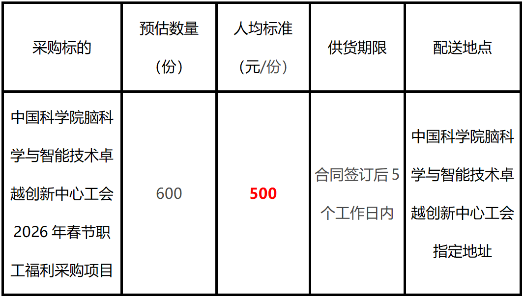 中国科学院脑科学与智能技术卓越创新中心工会需采购2026年春节职工福利,现进行公开招标,诚邀有意单位前来投标。