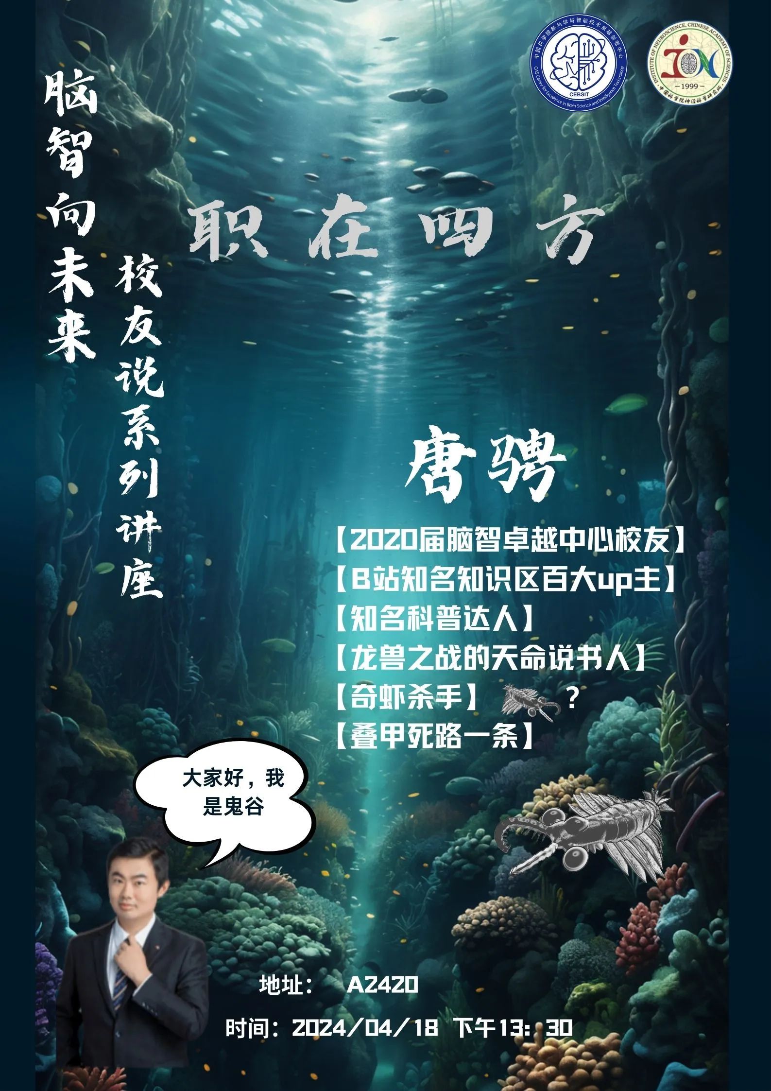 4月18日下午,脑智向未来——校友系列讲座顺利举办。中国科学院脑科学与智能技术卓越创新中心(神经所)2020届校友唐骋(b站up主:鬼谷藏龙)应邀回所,做了题为《科学传播可以作为硕博生毕业之后的职业选择之一》的精彩讲座。讲座由脑智卓越中心2023级硕博生陈世辉主持,中心师生积极参与。
