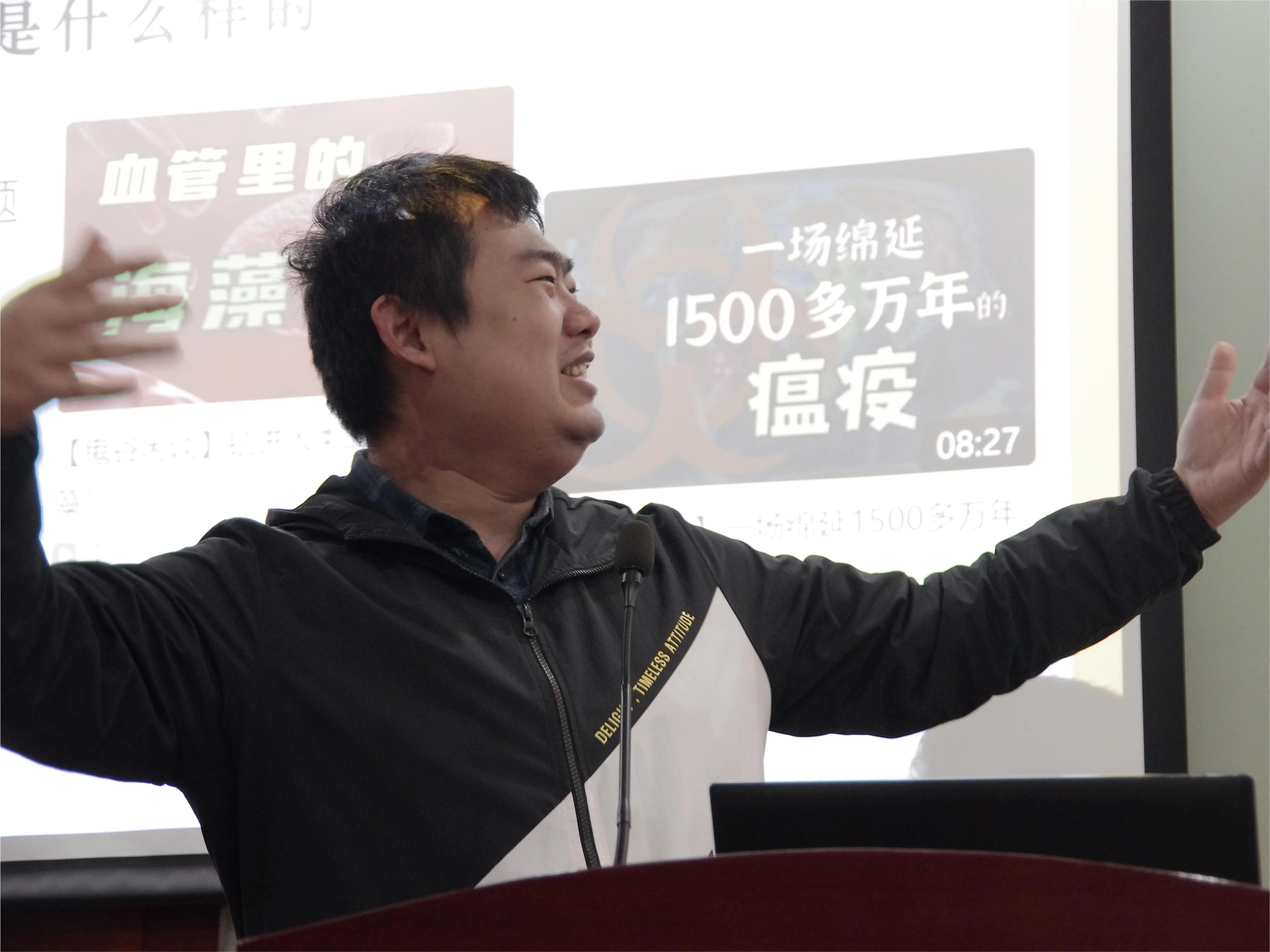 唐骋以其自我介绍开场:2014年开始正式创作科普文章到2019年正式开始科普视频制作,截至今年已经是获得三年哔哩哔哩百大up主荣誉,在哔哩哔哩平台拥有400万粉丝,并且成立了自己的小公司。10年风雨,唐骋早已蜕变。