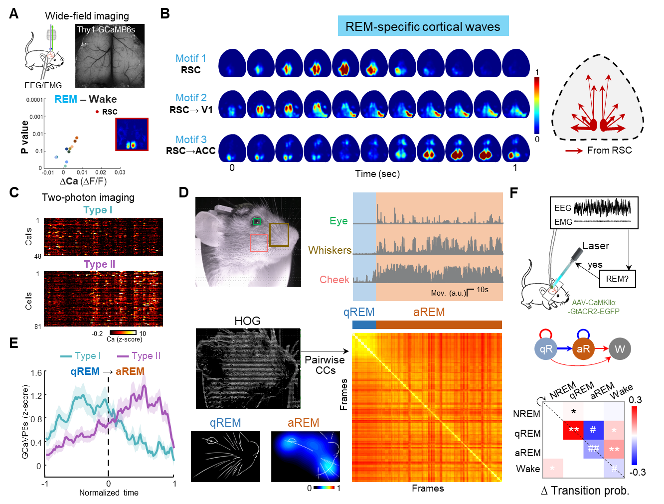 图注(A)双通道宽场荧光成像示意图(上);十一个功能模块REM睡眠与清醒状态活动差异(下)。(B)REM睡眠的三种主要钙波(左);REM睡眠中从RSC起始的钙波活动示意图,其中箭头粗细代表RSC与目标区域间钙活动的格兰杰因果关系值。(C)通过双光子成像得到RSC L2/3神经元活动并通过k-means聚类分成两种类型,图为一段REM睡眠中两类RSC神经元钙活动情况。(D)通过红外相机采集到REM睡眠中小鼠的面部视频(左上),其中小鼠眼睛、胡须和咀嚼肌位置的脸颊在REM睡眠后期有丰富的运动(右上)。下:利用HOG算法划分REM睡眠亚状态---qREM 和aREM。(E)RSC L2/3两类神经元在REM睡眠亚状态qREM到aREM 过程中的钙信号变化(数据处理将qREM和aREM长度标准化到1)。(F)闭环光遗传实验示意图(上)。在REM睡眠中特异性抑制RSC兴奋性神经元阻断了qREM到aREM的转换以及aREM的维持(下)。