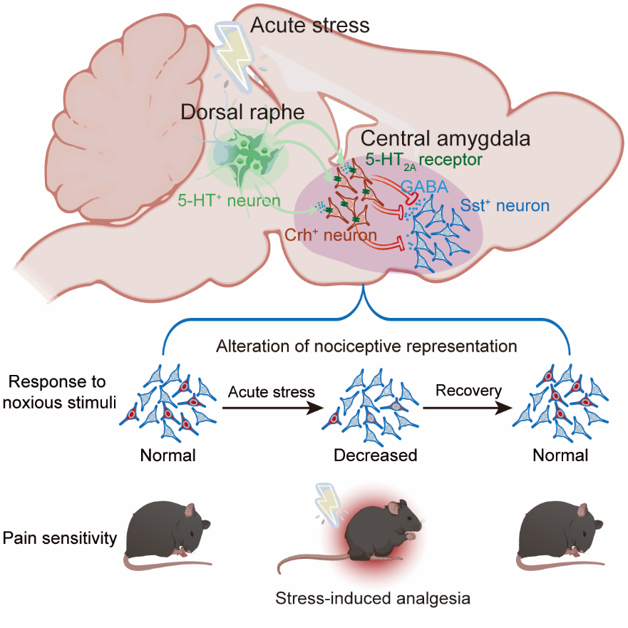 进一步的环路研究表明中缝背核(dorsal raphe nucleus, DRN)中的神经元在应激过程中持续被激活,并通过投射至中央杏仁核,作用于Crh⁺神经元上的5-HT2A受体,从而触发镇痛效应。敲低Crh⁺神经元中的5-HT2A受体可显著阻断应激诱导的镇痛效应,进一步验证了该信号通路在该过程中的关键作用。