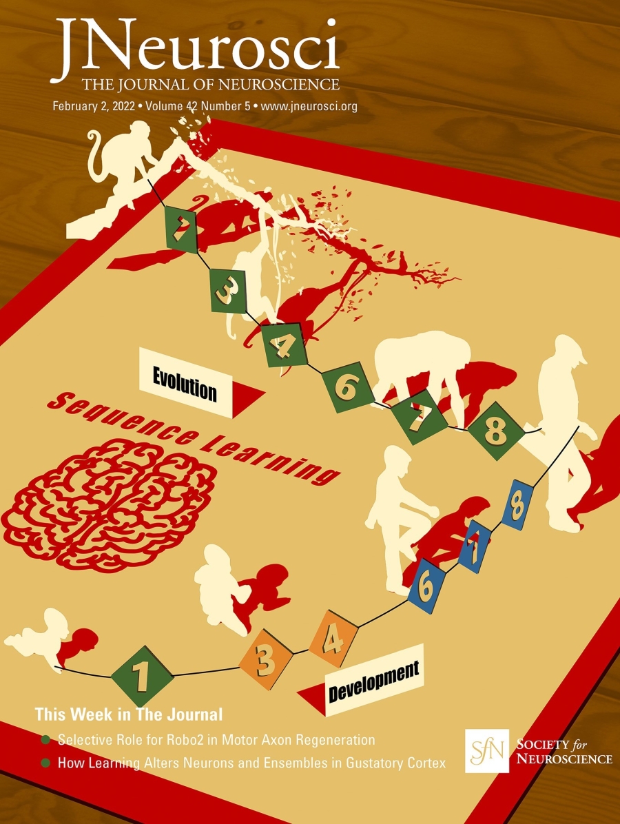 图1:《神经科学杂志》第42卷第5期封面:显示了应用于序列学习(数字字符串 1-3-4-6-7-8)的演化(上面的白色,从猕猴到人类)和发育(下面的白色,从婴儿到成人)因素。与猕猴不同,人类无论年龄大小都会自发地提取连续数字之间的关系,并使用组块化的策略压缩工作记忆中的序列。