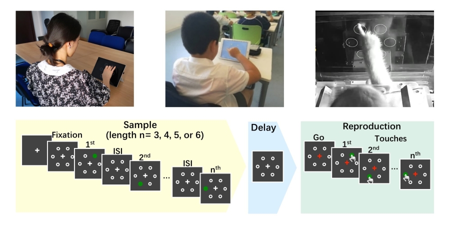 为了验证这些假设,王立平研究团队通过相同的空间序列生成任务测试了成人、儿童(6-7岁)和非人类灵长类动物(猕猴)的序列处理能力(图2)。