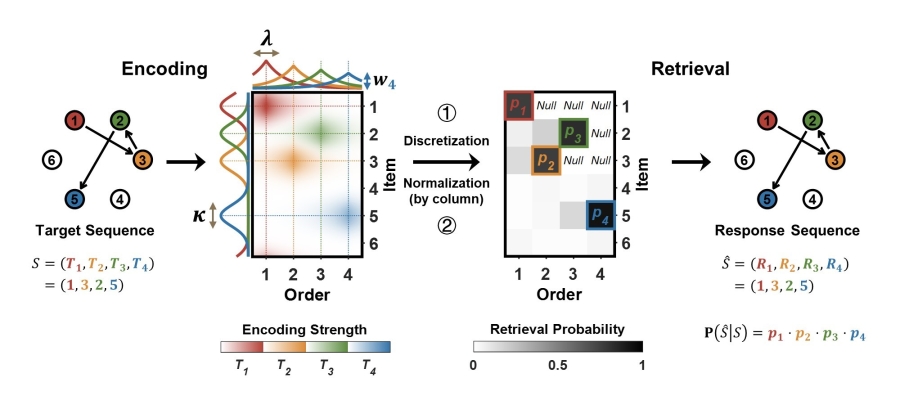 图3:联合编码模型示意图。模型分为两个阶段:在编码阶段,序列中的每一目标点都被拆分为独立的位置和顺序信息对应的分布,并组成联合分布,而所有目标点的联合分布最终再加权平均成为混合分布,用以刻画序列信息的总体编码强度;在检索阶段,混合分布经过离散化和归一化成为检索概率,从而可以计算出任意可能被汇报的序列的概率大小。其中,λ 和 κ 分别控制了顺序和位置信息的编码精度,而权重 {wi } 则控制了每个目标点联合分布的相对编码强度。