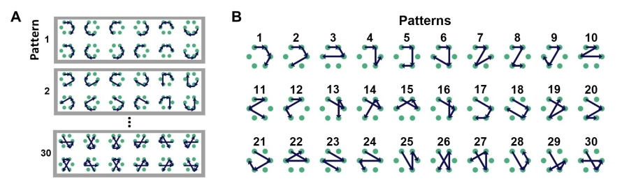 图4:(A)360种长度为4的序列。(B)30种图样。