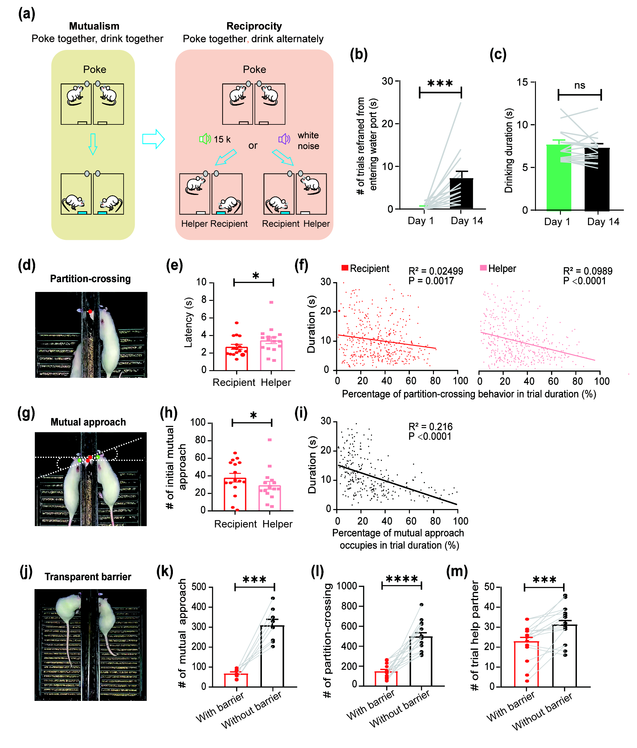 首先,实验室在此前建立的即时共利合作基础上,研究团队设计了延迟回报的互惠模式:两只大鼠被分别放置在相邻训练箱内,需在 1 秒内同时触碰各自的触发口才能完成一次合作。与传统的“共利(Mutualism)”任务不同,每轮合作中仅有一只大鼠可获得饮水机会,且获益方在不同回合中随机更换。这一设计模拟了“先付出、后回报”的情境,更贴近自然界中的互惠合作。经过训练,即使是非同笼的大鼠(理论无第二方/三方惩罚)大鼠不仅能够稳定地为同伴付出,还表现出显著增强的共情水平。