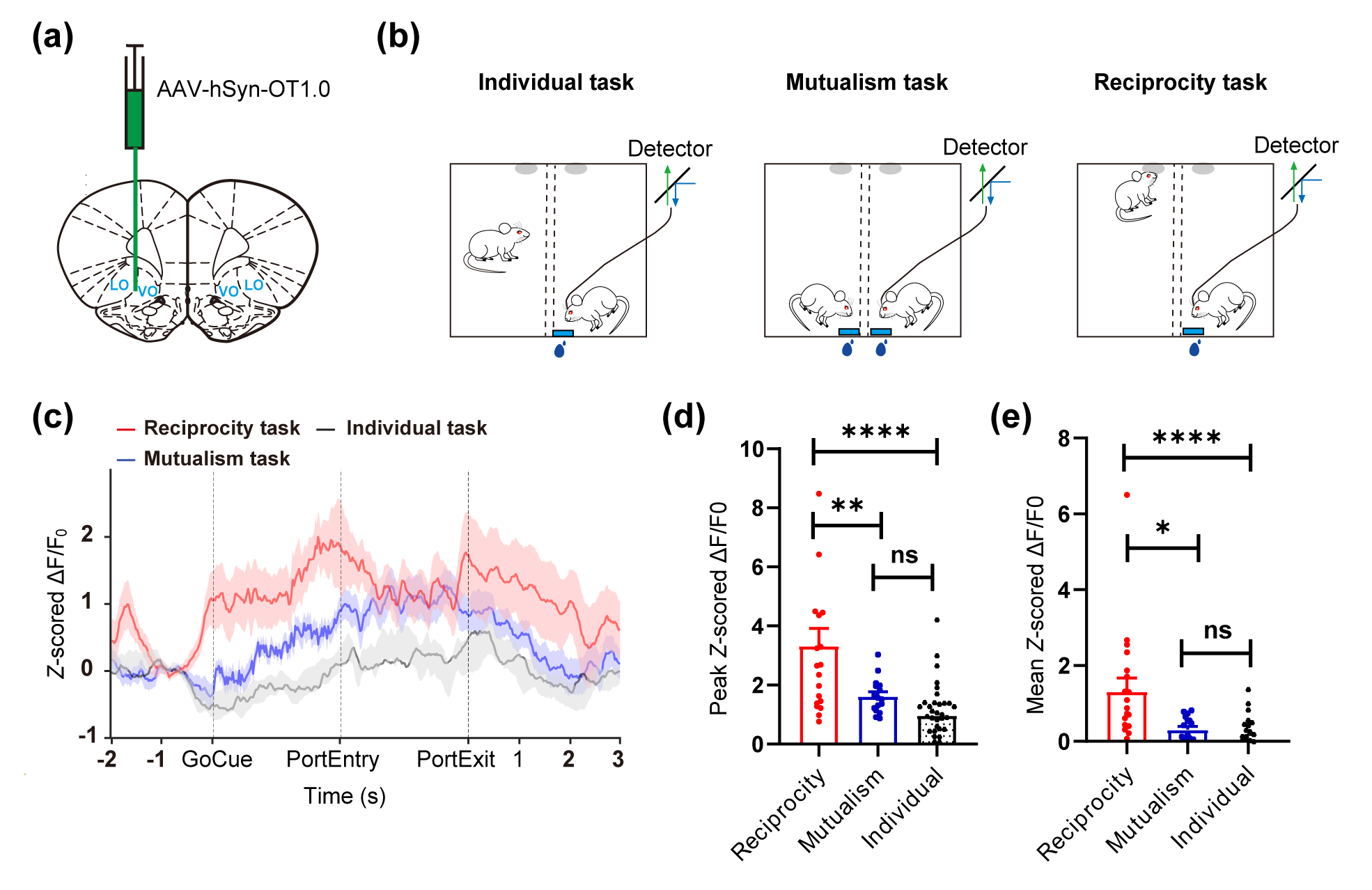 随后,研究团队利用 GRAB-OXT1.0 催产素探针结合光纤成像技术,发现互惠任务中额眶叶(OFC)的催产素信号峰值和均值均显著高于共利任务及单独(Individual)任务。此外,在催产素基因敲除(OXT-KO)大鼠中,互惠训练无法提升共情水平,“搭便车”比例显著上升,合作稳定性明显下降,表明催产素信号不仅参与社会行为调节,更可能是驱动互惠合作的重要内在机制。,