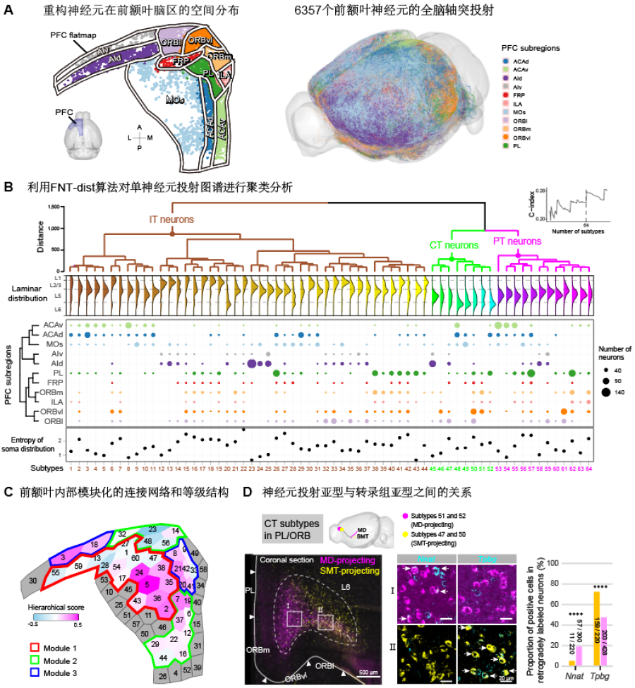 图注(A6357个前额叶单神经元在前额叶亚区的分布和全脑轴突形态。(B)神经元形态学分类。64个前额叶投射神经元亚型在前额叶亚区和皮层深浅的分布。(C)前额叶内部连接网络的模块化和等级结构。(D)前额叶投射亚型与基因亚型的关系(CT皮层丘脑神经元在PL-ORB脑区)。
