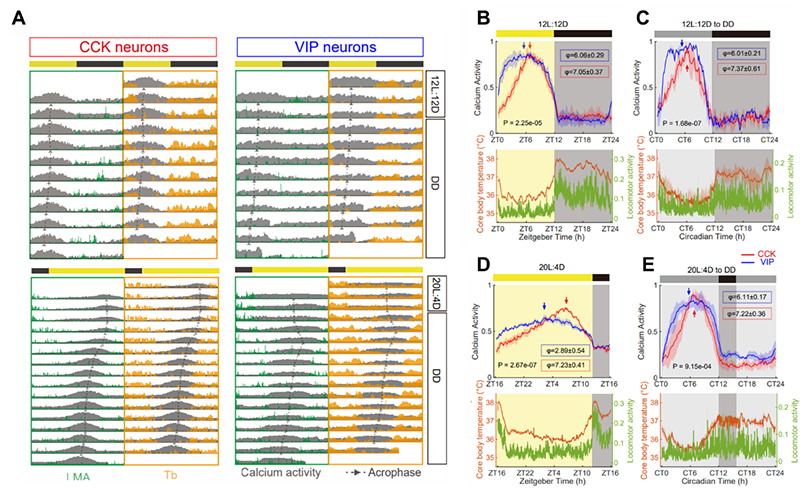 (A)不同光周期下CCK和VIP神经元的钙活动。(B-C)等长日照下的日均钙活动。(D-E)长日照下的日均钙活动。