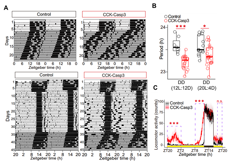 (A)不同光周期下损毁CCK神经元小鼠的转轮节律行为。(B)损毁CCK神经元导致小鼠节律周期缩短。(C)长日照下,损毁CCK神经元导致小鼠节律活动的始动点提前和结束点滞后。
