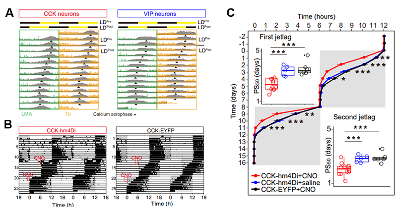 最后,研究人员通过在体光纤记录,进一步发现在小鼠中模拟倒时差的行为范式中,CCK神经元钙活动比VIP神经元钙活动的相位移动速度显著滞后,却与动物行为节律的相位移动速度一致,说明CCK神经元是引起时差反应的重要因素。利用化学遗传在体抑制或特异性凋亡CCK神经元能够加快小鼠调节时差的速度,帮助小鼠更快地从时差反应中恢复(图三)。