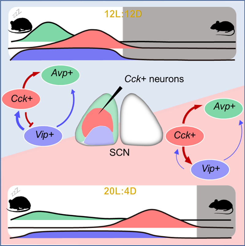 昼夜节律是生物为适应地球24小时自转而进化出的内在计时机制,对于生物的生存、人类的健康和发展至关重要。昼夜节律既能被外界信号(如光照)所牵引,又能在不同的环境(如季节更替)下稳定工作,但其背后的神经机制仍不清楚。位于下丘脑最下方的视交叉上核(SCN)被认为是哺乳动物最核心的昼夜节律起搏器。SCN通过接受外界信号的影响,产生自持的节律性振荡,调节机体的各项生理过程和行为以适应环境。小鼠的SCN中大约包含20000个细胞,其中的神经元主要通过神经递质和众多神经肽段的信号传导相互作用,形成具有节律功能的复杂神经网络。目前对SCN的研究主要集中在表达血管活性多肽(Vasoactive intestinal polypeptide , VIP)和精氨酸加压素(Arginine vasopressin , AVP)的这两类神经元中。此前,严军研究组通过单细胞测序和透明化荧光成像技术发现SCN中存在另外一类表达CCK神经肽的神经元(https://doi.org/10.1038/s41593-020-0586-x)。但是CCK这一类神经元在昼夜节律中的具体功能并不清楚。