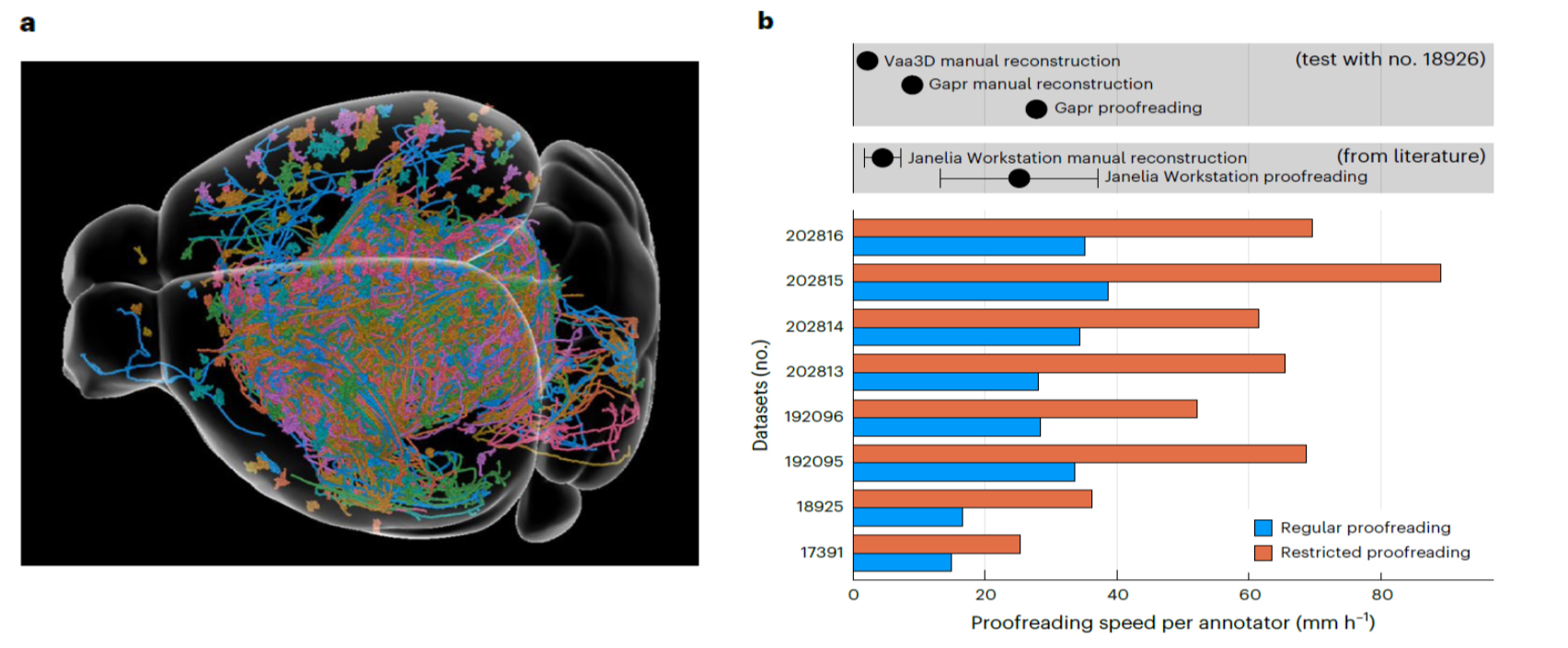 2024年7月3日,《Nature Methods》期刊在线发表了中国科学院脑科学与智能技术卓越创新中心(神经科学研究所)严军研究组题为《Gapr for large-scale collaborative single-neuron reconstruction》的研究论文。该论文介绍了严军研究组自主开发的名为Gapr的新一代大规模单神经元重构系统。Gapr创新地整合了基于深度学习的全自动重构、多用户同时参与协同校对、高效响应用户需求的图像数据处理等多种功能,大幅提升神经元重构的效率。Gapr的开发对推动全脑介观神经联结图谱的绘制具有重要意义。
