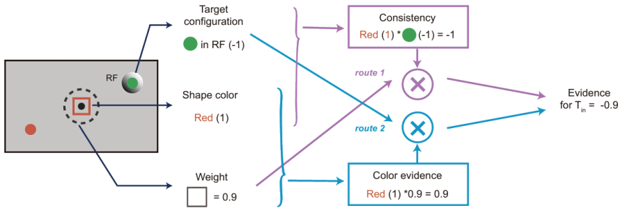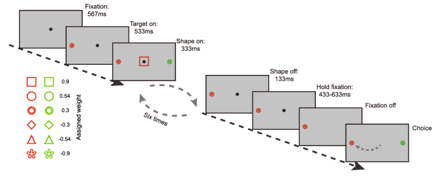 为解决这一问题,杨天明研究组为实验动物设计了一个概率推理任务。在此任务中,恒河猴根据屏幕上依次闪现的六个图形,在红绿两个目标选项之间进行抉择。这些图形可能为红色或绿色,而它们的形状提供了相应颜色选项的奖励概率的信息。猕猴需要累积六个图形所给出的信息,选择奖励概率较大的颜色目标。与之前研究中常见的实验任务不同,该实验抉择过程中的猴子在对图形信息进行累积之前,必须先根据图形的颜色和形状计算出需要累积的证据。如果在某一脑区中同时检测到从颜色形状等原始感觉信息到可累积的证据信息的转化过程,以及证据累积到抉择形成这两个计算步骤的信号,最合理的解释就是这个脑区独立地进行了整个证据累积的抉择过程,而不是简单地从其他脑区继承了这些信息。