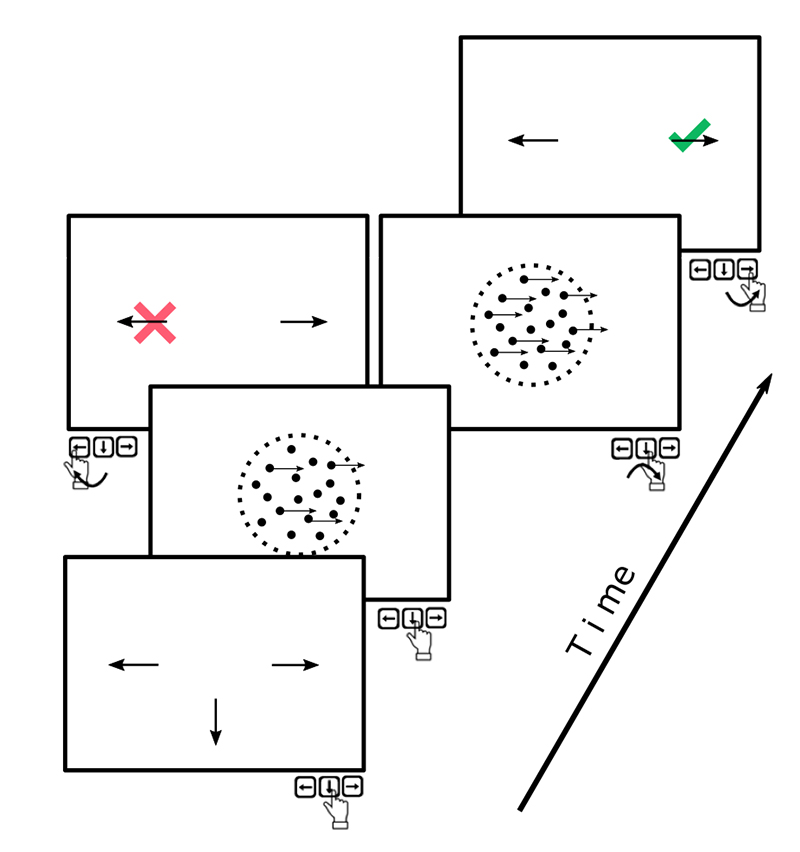 图1: 不确定性估计任务。被试需要通过观察屏幕上的随机点的运动来判断运动方向是向左还是向右,并通过按压左右方向键做出汇报。随机点带有噪音的,研究者通过控制噪音的大小来控制任务难度。被试如果在观看随机点的过程中感到不确定,可以选择按下箭头键,这时候随机点阵的噪音降低到一个很低的水平,被试可以更准确地来完成任务。