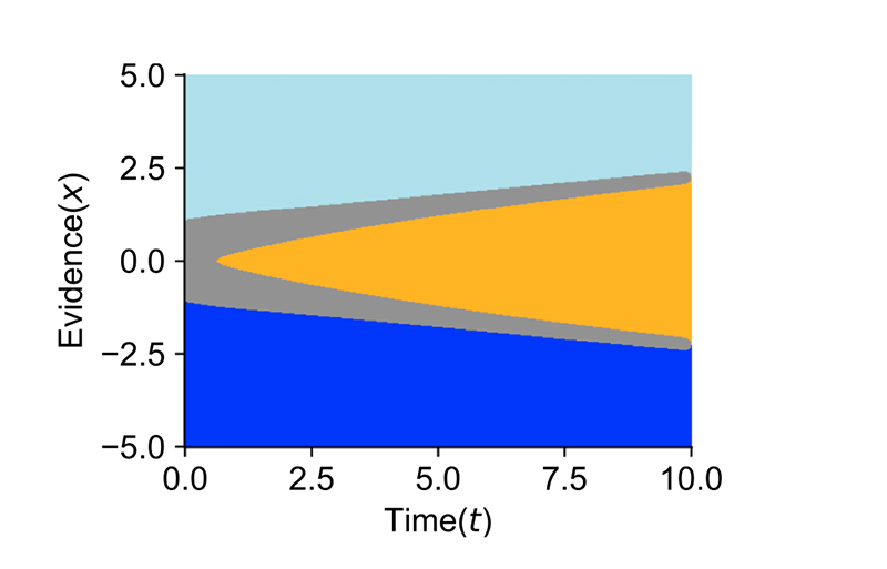 图2: 最优策略模型。横轴为时间,纵轴为累积证据。被试从0点(图最左侧中间)开始累积信息。图中的每一个点的颜色代表在当前时间下如果累积到一定证据下的最优策略:灰色代表等待;黄色代表“不确定”选择;深浅蓝色区域分别代表选右和选左的感知抉择。