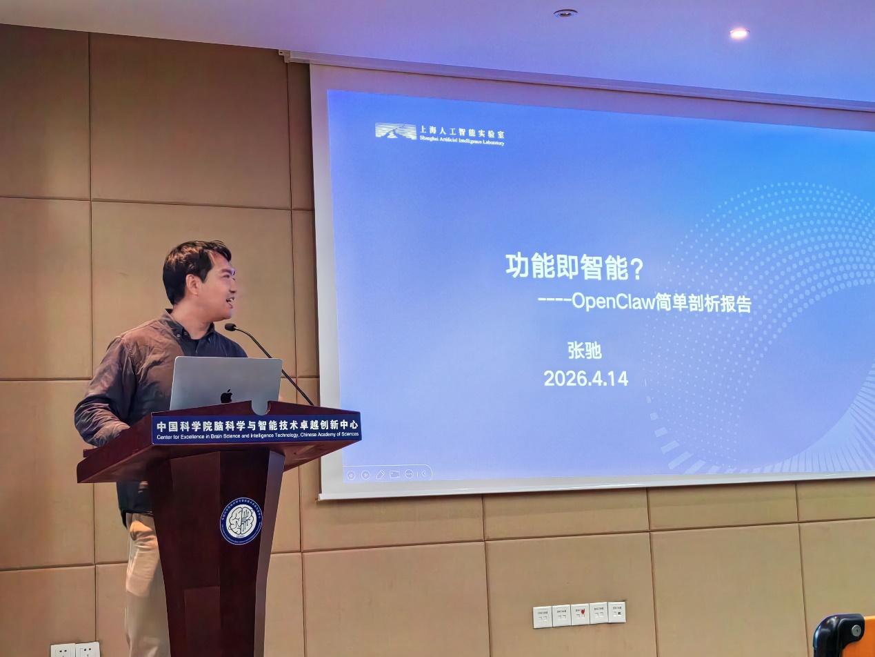 随后,上海人工智能实验室张驰研究员围绕近期广受关注的开源AI智能体架构OpenClaw(“龙虾”),从功能视角分析了类脑智能发展现状与未来方向。张驰研究员指出,领域内普遍认为2025年是AI元年,而作为Github有史以来星标数最高的开源软件,OpenClaw恰恰是AI智能体中“不AI”的部分。在大模型与智能体快速迭代的背景下,OpenClaw通过上下文工程、记忆系统与工具调用,提供了一个通用、与模型无关且能高效完成复杂任务的行动与记忆框架。这一技术方案本身并不具备智能,仅根据大模型指令调用工具,但已为业界指明了一条构建AGI的可行路径,因而成为重点发展方向。张驰研究员的报告引出一个深刻问题:这样的AI架构是否预示着人工智能的终极形态?这个追问背后,隐含着对AGI本质的思辨。