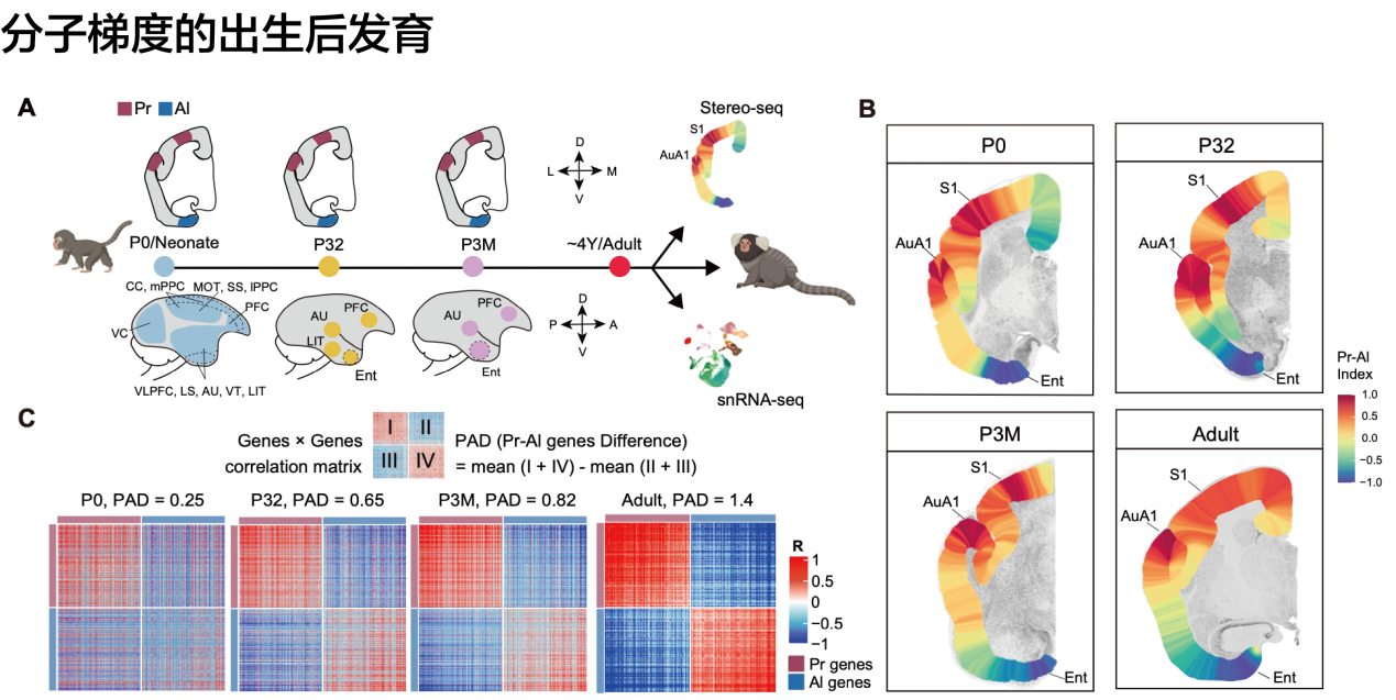 进一步发育分析显示,Pr-Al分子梯度轴并非在成年期才突然出现,而是作为一种先天的“原始蓝图”,在出生时(P0)即已存在雏形。在出生后的发育过程中,该梯度经历了一个显著的“精细化”过程。随着大脑的发育,PrAl两极的分子特征差异显著增强,原本相对弥散的基因表达模式逐渐“锐化”,形成了成年期界限分明的分布格局。这一发现表明,灵长类皮层的组织原则是由先天遗传程序设立初始框架,并通过后天的神经发育与潜在的感觉经验输入共同塑造,最终完成了皮层区域的功能特化。