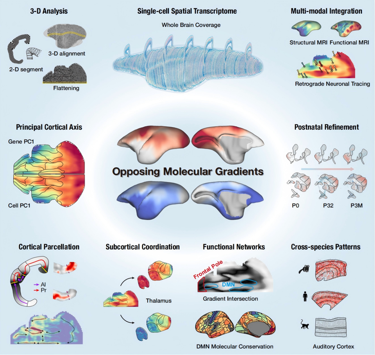 2026417日,中国科学院脑科学与智能技术卓越创新中心刘赐融研究组和孙怡迪研究组、杭州华大生命科学研究院副研究员郝世杰、澳大利亚莫纳什大学教授马塞洛·罗萨(Marcello Rosa )团队合作,在Science期刊发表《An opposing molecular gradient axis underlies primate cortical organization》的研究论文。该研究整合空间转录组学、磁共振成像与逆向神经示踪等多模态技术,发现皮层中存在两个起源相反、方向对立的分子梯度,该梯度分别以初级感觉皮层和古/异皮层为锚点,在出生后发育过程中逐渐精细化,不仅刻画了灵长类大脑皮层细胞组成和功能网络的空间架构,还与丘脑的基因表达及丘脑-皮层投射模式高度协同, 这一发现为长期以来关于大脑皮层扩张与组织起源的学术争论提供了新的整合性解释。