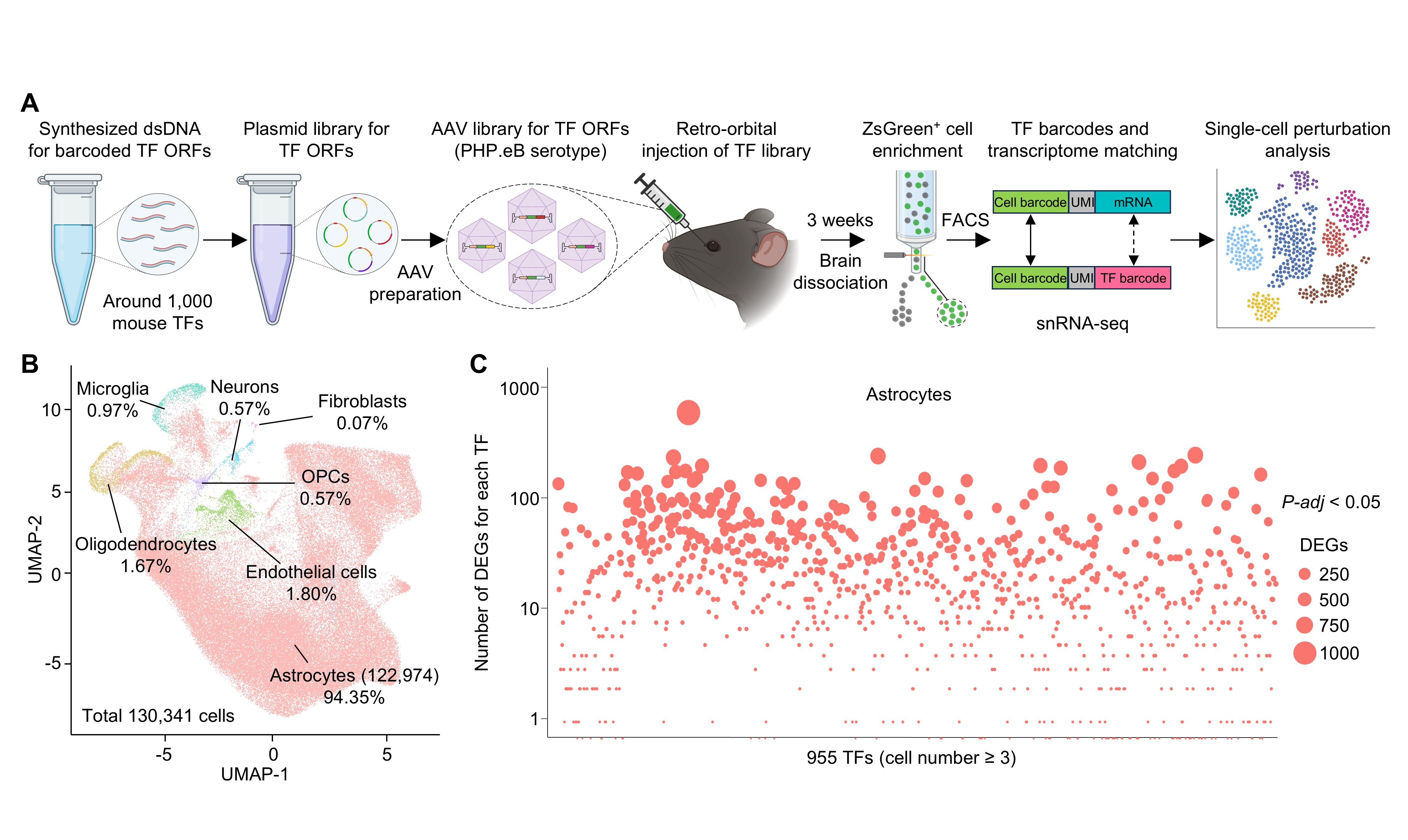 扰动测序(Perturb-seq)技术能够在单细胞分辨率下系统解析基因扰动效应,已被用于绘制遗传互作图谱和解析基因调控网络。然而,现有研究主要基于体外体系,新近发展的体内方法虽能揭示活体组织中的基因功能,但往往局限于小规模的功能缺失效应,尚缺乏大规模研究功能获得性效应的体内方案。星形胶质细胞作为中枢神经系统中的关键细胞,通过调控突触功能、维持稳态及参与炎症反应等机制发挥多样化功能,其功能程序的核心调控者转录因子在生理与病理条件下的具体体内作用仍不清楚。