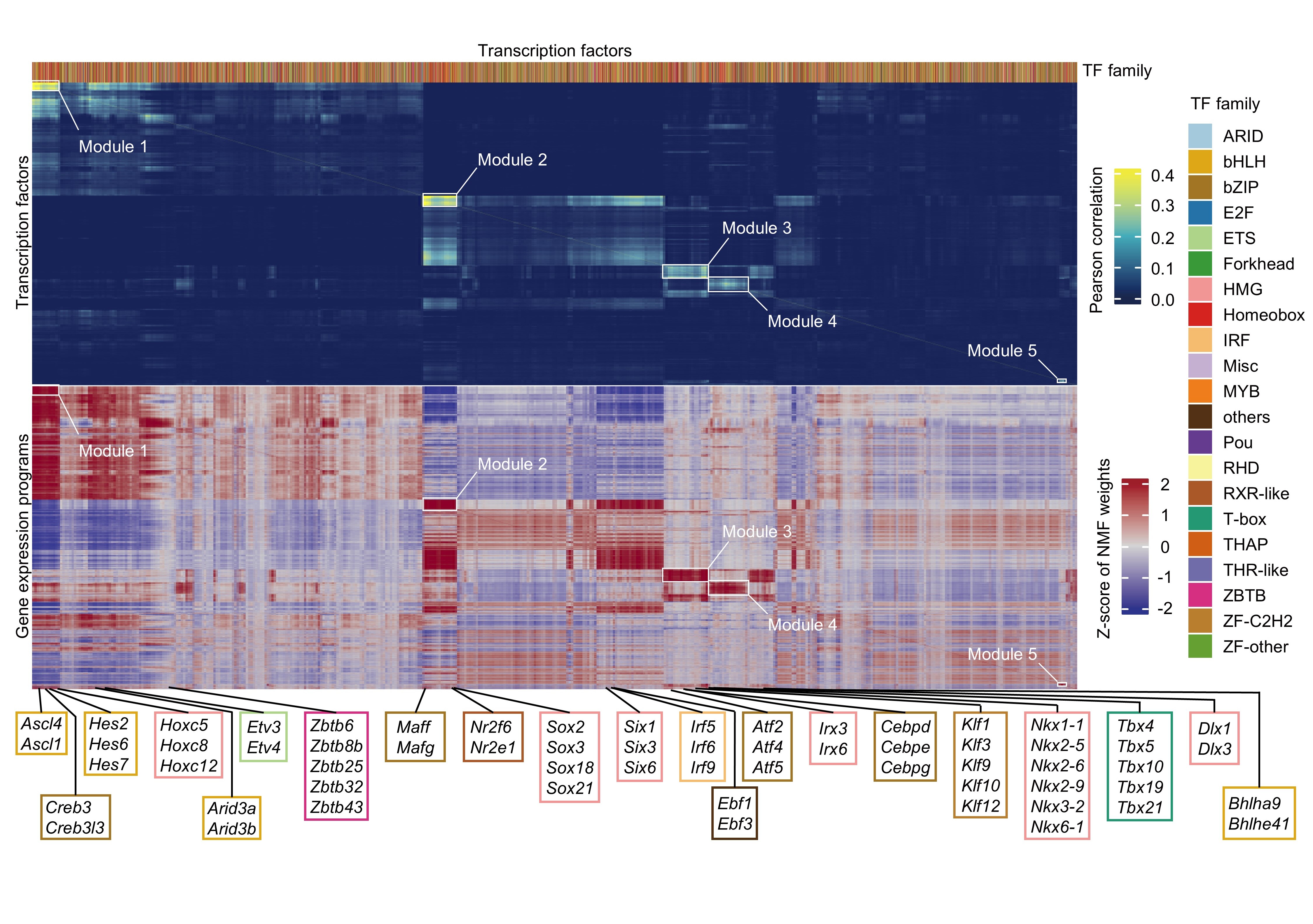 利用此平台产生的扰动细胞转录组信息,研究人员成功绘制了星形胶质细胞转录因子的系统性功能图谱,不仅从分子网络中呈现出转录因子(TF)与靶基因的调控关系,更通过体外细胞模型与在体动物实验,验证了图谱的准确性与可重复性。在此基础上,研究团队进一步构建了转录因子扰动与基因程序响应的体内关联模型,识别出多个具有协同调控作用的TF功能模块,揭示了星形胶质细胞内基因程序的模块化调控特征。同时,借助该模型,团队对此前功能未知或研究较少的转录因子进行了功能注释,明确了它们在调控星形胶质细胞氧化应激和炎症与免疫反应等功能中的潜在作用,为后续机制研究提供了新的线索与依据(图2)。