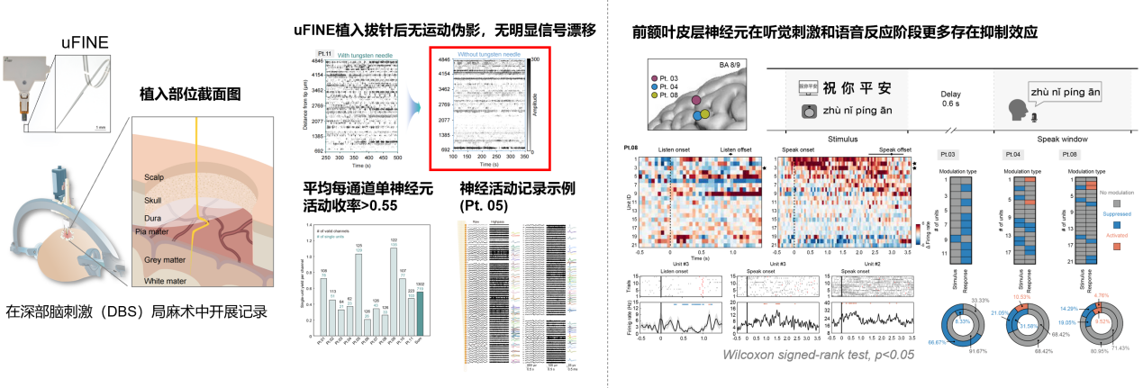 研究显示,团队在其中11名患者的多个皮层深度中成功分离出总计719个单神经元(Single units),并在单次记录中最高同时捕获了135个单神经元的活动。此外,借助该高密度记录技术,研究人员在患者执行“单词复述(听与说)”任务时,成功捕捉到了背外侧前额叶皮层(dlPFC)内单个神经元对感觉刺激和运动反应的异质性调控特征。这一成果充分证明了uFINE阵列作为临床神经生理学研究工具的巨大潜力,不仅为探索人类特有的复杂认知功能提供了全新的细胞级解析视角,也为未来脑机接口(BMI)技术在神经退行性疾病、精神障碍或脑损伤中的临床应用奠定了坚实的硬硬件基础。