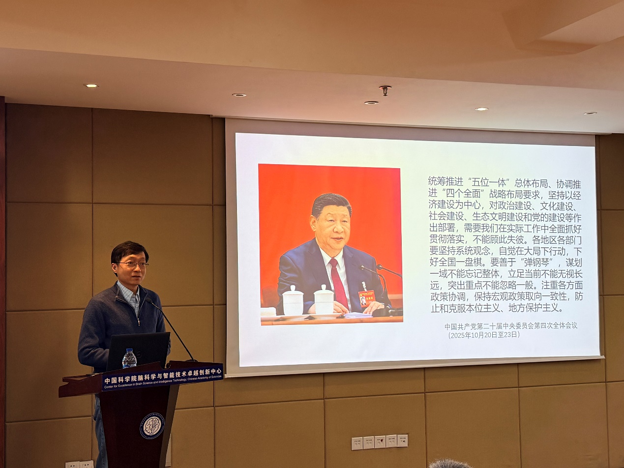 中心党委书记、副主任孙衍刚作“勇担科技自立自强使命,夯实中国式现代化的基石”的专题报告。强调作为国家战略科技力量的重要组成部分,导师要牢记“为党育人、为国育才”初心使命,立足脑科学前沿与国家重大需求,将育人工作与科研攻坚融合,为脑科学与智能技术领域实现高水平自立自强贡献力量,将“十五五”宏伟蓝图转化为社会主义现代化实践。