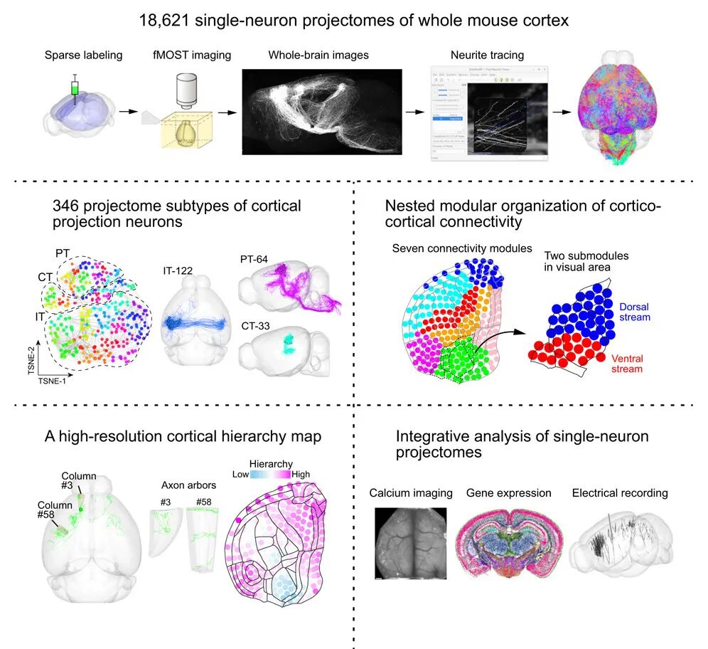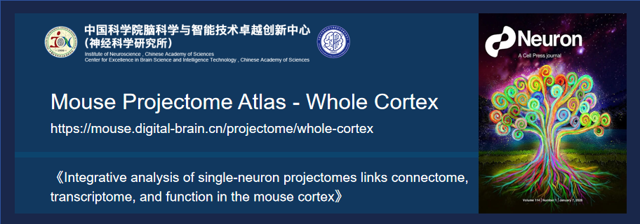 近日,最新发布了小鼠全皮层区域的单神经元投射图谱数据库资源(https://mouse.digital-brain.cn/projectome/whole-cortex)。用户只需通过浏览器,即可直观了解这些神经元的形态、投射特征和统计分析。该数据集由脑智卓越中心联合华中科技大学苏州脑空间信息研究院等团队合作完成。研究人员重建了小鼠大脑皮层中18621个神经元,确定了346种具有区域和层特异性分布的投射定义亚型。该分析揭示了七个皮层-皮层联接的亚模块结构、高分辨率的皮层层级分布以及单个神经元在皮层内多样化的轴突末梢分布。这些发现完善了传统的皮层-皮层联接和前馈/反馈模型。此外,该研究还揭示了精细的皮层-皮层下投射,包括多个超直接的皮层-基底神经节通路,并构建了皮层神经元与其皮层下投射靶区之间的详细拓扑投射。该研究成果以封面文章的形式发表在Cell Press细胞出版社旗下Neuron期刊(DOI: https://doi.org/10.1016/j.neuron.2025.10.019)。
