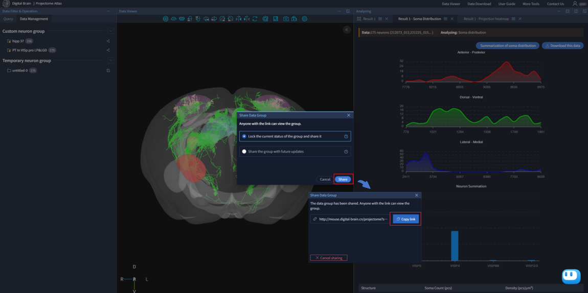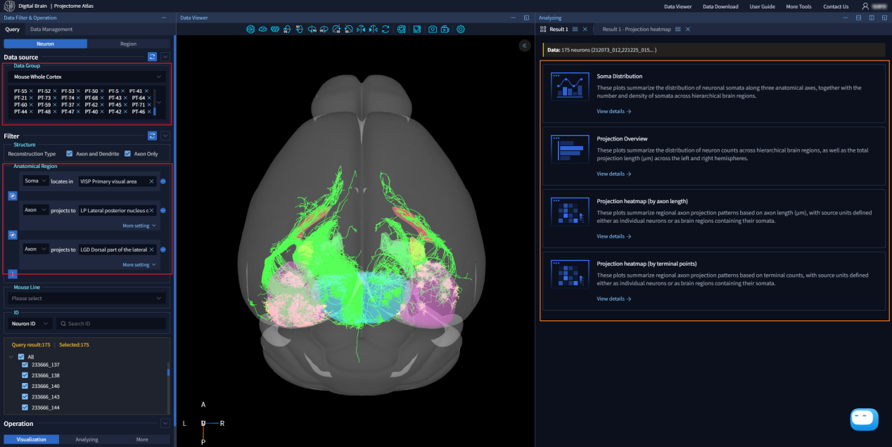 研究人员通过对全脑范围内神经元轴突形态进行系统聚类,定量刻画了单神经元轴突形态的相似性,获得了346个皮层神经元投射组亚型。平台支持用户通过浏览器灵活筛选并查看该数据集的神经元亚型。在可视化窗口中,用户可直观查看神经元形态、空间分布以及全脑投射情况,并可将感兴趣的神经元一键保存为自定义群组进行针对性分析与数据组分享,或选择多个亚型的神经元进行对比分析探索。研究人员能够直观地理解数据,为进行功能实验或后续深度分析提供线索。