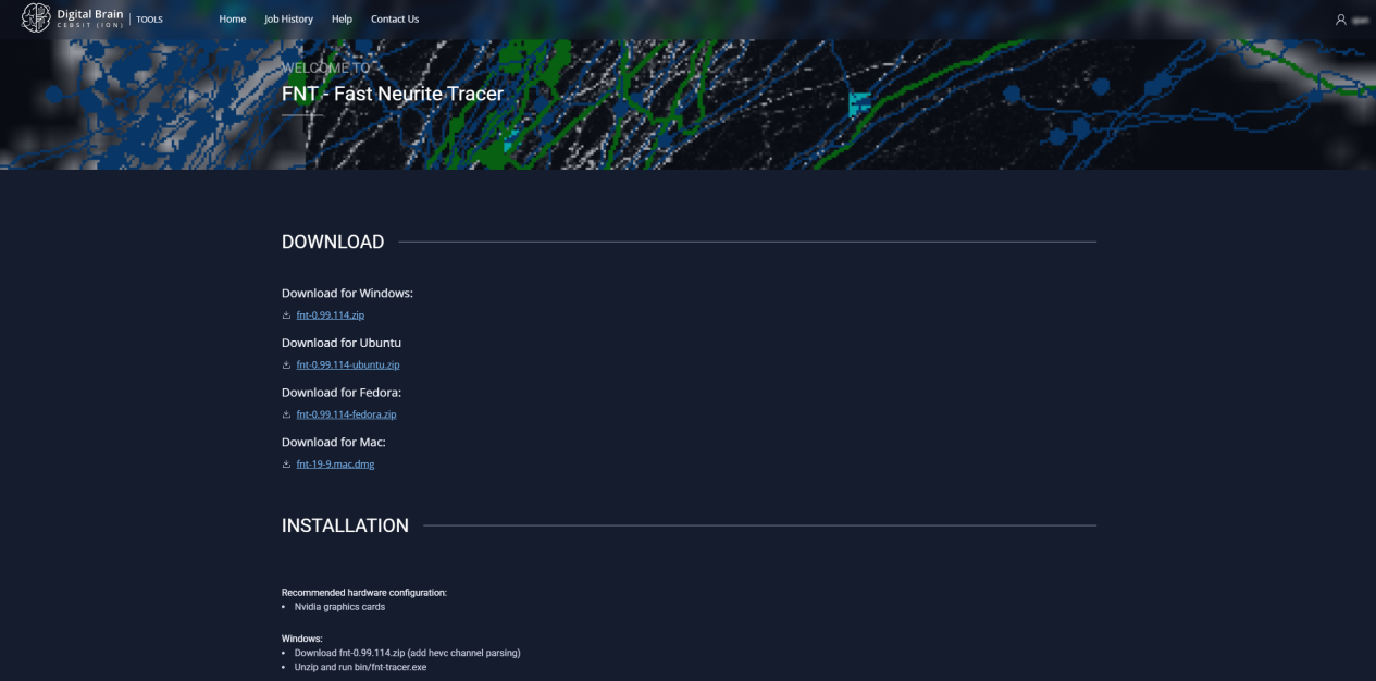 本系统也集成了脑智卓越中心前期开发了Fast Neurite Tracer(FNT)以及Gapr accelerates projectome reconstruction(GAPR)神经元追踪软件(Gou et al., 2024)工具。用户可点击导航栏上的更多工具【More Tools】下载相应的工具。