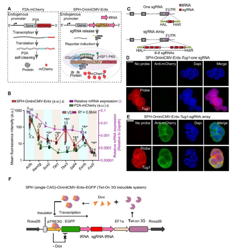 图注1:(A)示意图显示P2A-mcherry和SPH-OminiCMV-Ents两种标记基因的策略。(B)在mESC细胞中用SPH-OminiCMV-Ents策略(红色三角形)和P2A- mCherry策略(绿色菱形)标记不同的基因,统计其mCherry荧光信号强度以及用qPCR分析这些基因的表达水平(紫色圆圈,紫色y轴)。(C)示意图显示插入一个sgRNA或一个sgRNA阵列的标记策略。(D,E)Fish图像显示对lncRNA Tug1在3'UTR中插入一个sgRNA或一个sgRNA阵列后,细胞系中mCherry报告荧光信号的表达情况。(F)可控的Tet-on系统示意图,Dox诱导EGFP-sgRNA前体转录,成熟的sgRNA释放出来激活mcherry报告系统。