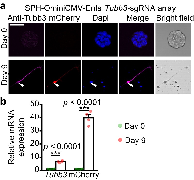 为探讨此系统是否能够随着基因表达量的增高,其报告系统也能监测出信号增强的变化。团队选取了表达量在小鼠胚胎干细胞中表达量低,但体外分化成神经元后表达量会增高的Tubb3基因。实验结果显示,分化后Tubb3的基因表达量不管是mRNA还是蛋白水平的表达量均增高,报告系统中的红色荧光信号也随之增高,能够反映基因表达的动态变化。