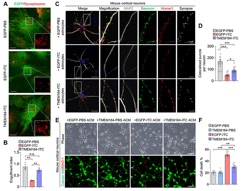 图1. 跨膜蛋白TMEM164调控神经毒性星形胶质细胞的激活。(A-B)TMEM164过表达维持星形胶质细胞在炎症条件下的细胞吞噬功能。(C-D)TMEM164过表达基本维持星形胶质细胞在炎症条件下促进神经元突触生长的功能。(E-F)TMEM164过表达抑制由神经毒性星形胶质细胞条件培养基诱导的神经元死亡。