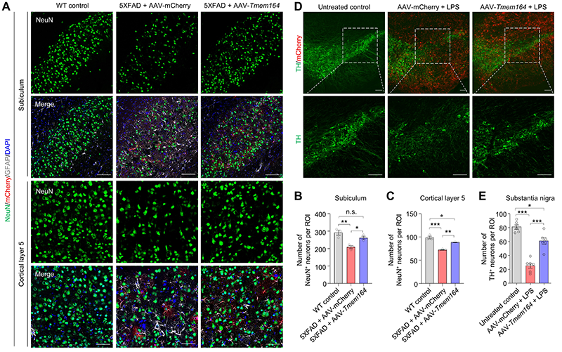 图2. AAV介导的星形胶质细胞特异性过表达TMEM164抑制AD和PD小鼠模型中的神经元死亡。(A-C)AAV介导的全脑星形胶质细胞特异性过表达TMEM164抑制5XFAD小鼠大脑海马下托和皮层第五层的神经元死亡。(D-E)AAV介导的星形胶质细胞特异性过表达TMEM164抑制LPS诱导的PD小鼠模型大脑黑质区的神经元死亡。